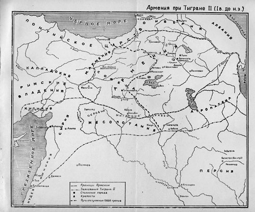 высшую ступень политического могущества было суждено сыну Тиграна I, Тиграну II Великому (95—56 гг.)*. Политическая кон'юнктура эпохи способствовала такому усилению небольшого, сравнительно, армянского царства, и годы царствования Тиграна Великого остались в памяти национальных историков и народа, как время высшей славы Армении. Так как эта эпоха в истории Армении известна нам более, чем другие, она может бросить свет и на все состояние страны во II—I в. до н. э.