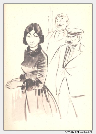 օր. Նվարդին, իսկ օր. Նվարդի տափակ հանաքները օր. Վարդուհու ականջներն ու հոգին տանջում են, բռնաբարում են համարյա, ոչ խոսքն է օգնում, ոչ վրդովմունքը։ Պ. Մարուքեն թերթ է կարդում և քթի տակ ծիծաղում է օր. Վարդուհու վրա, իսկ երբ լսում է պ. Աշոտի դողդոջուն ձայնը, որով նա խնդրում է օր. Նվարդին մի բաժակ թեյ ես լցնել — աչքերը բարձրացնում է թերթից և պաղ նայում է պաշտոնակցի դեմքին։ Իսկ պ. Բյուզանդ Վարդերեսյանը համարյա ամեն օր մեծ դասամիջոցին հաճույքով վիճում է օր. Վարդուհի Զատիկյանի հետ բարոյախոսության մասին և գոհ է թե իր հայացքներից, թե իր խռպոտ ձայնից և թե, մանավանդ, օր. Վարդուհուց, որ միշտ համաձայնվում է նրա հետ և միշտ ասում է, հայացքը օր.Նվարդին դարձնելով, «Ճի՛շտ է, պ. Բյուզանդ. մարդիկ, մանավանդ կանայք, պետք է առաքինի լինեն։ Ես միանգամայն համաձայն եմ Ձեզ հետ, պ. Բյուզանդ»։ Եվ պ. Բյուզանդը, գոհ, ժպտադեմ՝ սրբում է իր նաիրյան մեծ քիթը կարմիր թաշկինակով։