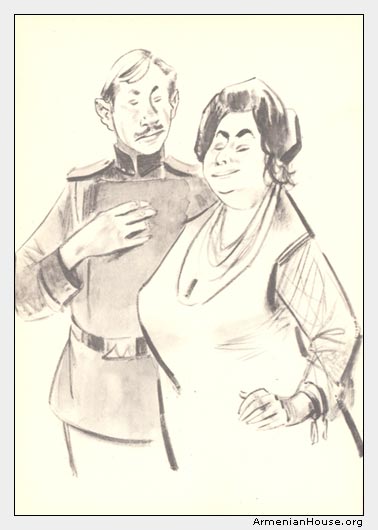 Ալոշին, և ամեն առավոտ, երբ նա հաշտարար դատավոր Օսեփ Նարիմանովի հետ անցնում է դպրոցների առաջից.— ռեալական դպրոցի տեսուչ Արամ Անտոնիչ — «Փուքսը» (այսպես են անվանում դպրոցի տեսուչ Արամ Անտոնիչին չարաճճի աշակերտները՝ նրա փորի բավականին պատկառելի մեծության պատճառով) — բացականչում է վերից՝ տեսչանոցի պատուհանից.— Խորի՜ն հարգանքներս Ալյոշա Նիկիտիչին, Օսեփ Կարպիչին — նույնպե՛ս»։ Դպրոցի աշակերտները շատ անգամ են լսել իրենց խոժոռ տեսչի սիրալիր այս բացականչությունը վերոհիշյալների հասցեին — և թերևս մի քիչ էլ այս է պատճառը, որ նրանք, դպրոցի աշակերտները, մի առանձին հարգանք են տածում դեպի Գեներալ Ալոշը և Օսեփ Նարիմանովը։ Ասում եմ «մի քիչ», որովհետև հիշյալ պատկառելի քաղաքացիներին հարգելու ուրիշ պատճառներ և միանգամայն արդարացի հիմքեր ևս ունեն ռեալական դպրոցի չափահաս աշակերտները։ Երբ, Զատկին կամ Ծննդին, դպրոցական երեկույթներ են լինում դպրոցի սրահում — ովքե՞ր են բազմում առաջին կարգի նստարանների վրա, գավառապետի կողքին.— Գեներալ Ալոշը և Օսեփ Նարիմանովը։ Եվ կամ երբ տոնածառի լուսազարդ ճյուղերից կախված շաքարե թիթեռնիկներն ու գույնզգույն կոնֆետները ստանալուց հետո աշակերտները գնում են տուն և միայն հյուրերն ու ուսուցիչներն են մնում ընթրիքի— ովքե՞ր են բացակայում միշտ՝ ելնում են սեղանի վրայից ու քչփչալով շրջում մութ դասարաններում.— տեսչի կին Օլգա Վասիլևնան — Շիկահեր Դդումը (ինչպես անվանում էին նրան աշակերտները) և Օսեփ Նարիմանովը — մեկ,— և հետո՝ Ալյոշա Նիկիտիչը՝ մերթ օրիորդաց գիմնազի վարժուհի Վառյա-հոգյակի հետ թևանցուկ, մերթ էլ թվաբանության ուսուցիչ Բարսեղ Աբգարիչի կնոջ — «Ճուտ»–ի իրանը գրկած։ Այս ամենն իր սեփական աչքերով տեսել է հինգերորդ դասարանի աշակերտ Վարդանյան Սերգուշը և պատմել է ընկերներին ամենայն մանրամասնությամբ։ Իսկ նման դեպքերից մի շաբաթ անց սովորաբար ռեալական դպրոցի և օրիորդաց գիմնազի արտաքնոցների պատերին լույս են տեսնում վերոհիշյալ անցքերին վերաբերյալ բավականին հետաքրքիր հանգավոր և անհանգ գրություններ, որոնք շատ շուտով տարածվում և բերանից բերան են անցնում ո՛չ միայն հիշյալ դպրոցների պատերում, այլ այդ պատերից բավականին հեռու գտնվող շատ և շատ ընտանեկան հարկերի ներքո, նույնիսկ Տելեֆոն Սեթոյի սրճարանում։ Եվ արդյոք նրանք չե՞ն մեղավոր (Գեներալ