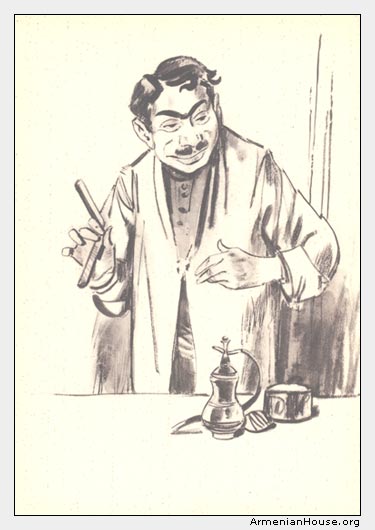 «Խորին հարգանքներս պ. Մարուքեին» — ասում է վարսավիր Վասիլը, գլուխ տալով, երբ պ. Մարուքեն մտնում է ներս։ Պ. Մարուքեն թեթև գլխով է անում և լուրջ, սփրթնած դեմքով նստում է հայելու առաջ։ Աչքերը փակում ու, ծույլ, փափկաթոռի մեջ ընկղմած, սպասում է, մինչև տաք, կակուղ խոզանակը, սապոնոտ սահելով՝ քսվի դեմքին և իր այտերի վրա շոգ, տաք՝ զգա վարսավիր Վասիլի արաղահամ շնչառությունը։ «Զգույշ» — բարկացած վեր է