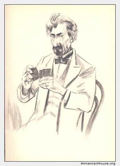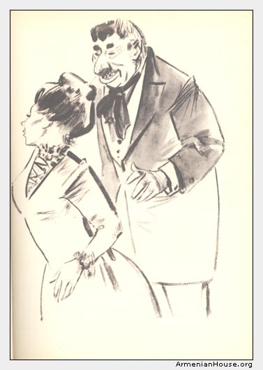 «Համեցե՛ք նստի, էս է, կվերջացնեմ»—շրթունքները հեռացնելով պ. Մարուքեի դեմքից, ժպտալով պատասխանեց վարսավիրը.— «Քեֆերդ տեղը կերևա. փա՛ռք Ալլահին»։— «Ինչո՞ւ չերևա, աղա՛ս»,— բացականչեց Հաջին բարկացած.— «Տղա մըն ալ ավելցավ Հայաստանին, աս անգամ մանչ է, յա՜...»։ Հերո՛ս էր, Հաջի Մանուկոֆ էֆենդու կնիկը— Նունուֆար հանըմը— տղա էր բերել։
