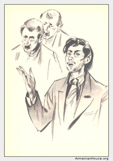 «Դուք գիտեք,— ասաց Մազութի Համոն հարցի գործնականին անցնելով,— որ, երկրորդ շաբաթն է արդեն, ինչ պատերազմ է հայտարարված մեր դարավոր թշնամուն— ոսոխին։ Մեր հաղթապանծ զորքերն արդեն մտել են թշնամու սահմանները,— մո՜տ է, մո՜տ է արդեն փառավոր այն օրը, երբ մեր փառավոր զորքերը Էրզրում կմտնեն։ Ծանրության կենտրոնը հիմա նրանումն է, որ մենք, նաիրցիներս, հարկ եղած լրջությամբ գիտակցենք, հասկանանք լիովին այն խոշոր նշանակությունը, որ ունեն այդ անցքերը և կարող են ունենալ մեր հարցի համար։ Բավական է գիտակցել այս հանգամանքը միայն, որպեսզի հասկանանք, որ չի կարելի այսօր, այո՛, չի կարելի ձեռքերը ծալած նստել, հարկավոր է ցույց տալ մեզ բոլորիս համար