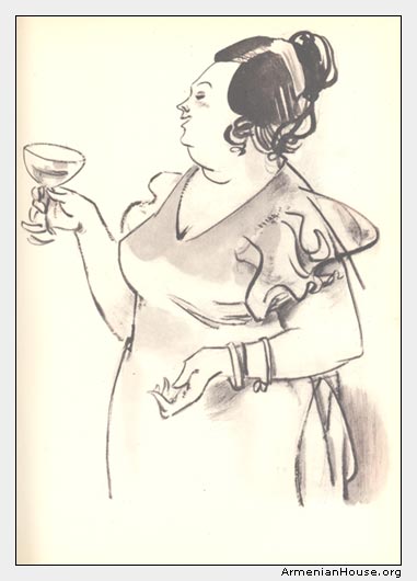Խորհրդավոր ժպիտը դեմքին, ժպիտ, որի մեջ խառը կային թե՛ զարմանք, թե՛ անսպասելի ուրախություն և թե խորին ակնածանք,— հանդիպնց Հաջի Օնիկ էֆենդուն Հաջու ազիզ կողակիցը— Նունուֆար հանըմը. շնչասպառ, նրան հանձնեց իր ձեռնափայտը Հաջին և ուզում էր արդեն ընդունարանը մտնել, երբ Նունուֆար հանըմը կտրեց նրա ճանապարհը. Նունուֆար հանըմը մատները դրեց Հաջի Օնիկի շրթունքներին.— «ը՛ս՛ս՛ս՛» — մատները Հաջու շրթունքներին դնելով՝ խորհրդավոր ժպտաց Նունուֆար հանըմը. «յա՛վաշ, հերիֆ, նեսը մարթ կա...»։ «Վո՜վ կա»— չոր, ցցվեց էֆենդին՝ դեմքին վախ ու սարսափ, ու չհամբերեց,—արագ դեպի իրեն քաշեց դուռը... ու մնաց քարացած։ Հյուրասենյակում նստած էին — երևակայո՞ւմ եք— Համո Համբարձումովիչը, բժիշկը և,— Հաջու համար ամենազարմանալին ու ամենաանսպասելին,— քաղաքի պարետը (բարձրահասակ սպան)... «Է՛, շա՞տ պիտի երկարի սա սարսաղությունը»— ներս մտնելով հարց տվեց Հաջին՝ հերթով նայելով Համո Համբարձումովիչի, բժշկի և բարձրահասակ սպայի (քաղաքի պարետի) դեմքերին, բայց Համո Համբարձումովիչի, բժշկի և քաղաքի պարետի (բարձրահասակ սպայի) դեմքերն անպատասխան թողին Հաջի Մանուկոֆ էֆենդու հարցմունքը։— «Է՛, էրթա՛նք, էրթա՛նք մեյմեկ թաս օղի առնենք»— ավելացրեց Հաջին՝ ընդհանուր շփոթմունքը ցրելու ցանկությամբ։ Ու մտան ճաշասենյակ։