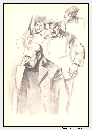 Մենք արդեն անցնում ենք նաիրյան այդ քաղաքի և սույն այդ պոեմանման վեպի վերջին դեպքերի նկարագրությանը,— և մի սուր, անողոք, դառնաթախիծ կսկիծ սկսում է ուտել մեր սիրտը, ձեռքս կրկին սկսում է դողալ, և գրությանս տառերը գրվում են ծուռ ու դողդոջ, կարծես օրորում է տողերս աներևույթ մի հողմ... Սև, մրուրոտ, արյունալի են այդ դեպքերը, որոնց նկարագրությանն անցնելու ենք հիմա, ընթերցո՛ղ, և չգիտենք՝ կարողանալո՞ւ է արդյոք մեր