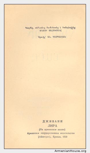 | Աղբյուր. Ջիվանու քնարը: [Ստեղծագործությունների ընտրանի] / Կազմ., առաջաբ., տեքստ. համեմատ., ծանոթագր. ՝ Ա. Սահակյան; Խմբ.՝ Միք. Հարությույան; Նկ.՝ Ան. Գասպարյան։ «Հայպետհրատ»։ Երևան 1959 |