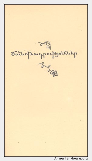 | Աղբյուր. Ջիվանու քնարը: [Ստեղծագործությունների ընտրանի] / Կազմ., առաջաբ., տեքստ. համեմատ., ծանոթագր. ՝ Ա. Սահակյան; Խմբ.՝ Միք. Հարությույան; Նկ.՝ Ան. Գասպարյան։ «Հայպետհրատ»։ Երևան 1959 |