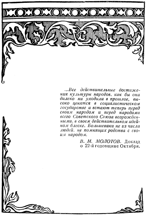 В предлагаемой вниманию читателя работе приведены некоторые факты из истории культуры народов СССР, внушающие советскому человеку патриотическое чувство законной национальной гордости. Характерной чертой советского патриотизма является чувство гордости у всех народов СССР за лучшие национальные традиции каждого народа, входящего в состав великого содружества равноправных наций, общими усилиями воздвигающих светлое здание коммунизма,
