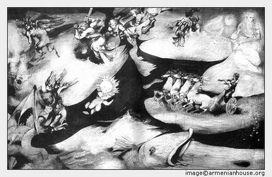 Առավոտ վաղ, երբ արևը դուրս է գալիս ծովից ու երկրին շատ մոտիկ է լինում, նրա սաստիկ ջերմությունից երկիրը կարող է այրվել ու մոխիր դառնալ։ Բայց այդ պահին նրա դեմ է ելնում մի վիթխարի թռչուն և իր հզոր թևերը տարածելով՝ պատսպարում է երկիրը արևի այրող ճառագայթներից։ Կեսօրին, երբ արևը հասնում է երկնքի մեջտեղը և հեռանում երկրից, նրա ջերմությունը թուլանում է, և վտանգը վերանում։ Այդ ժամանակ արդեն խանձված են լինում թռչունի թևերը, և նա ուժասպառ ու կիսամեռ ընկնում է ծովը, զովանում, բուժում իր թևերը։ Հաջորղ առավոտ կազդուրված՝ նա դարձյալ ելնում է արևի դեմ, իր հովանու տակ առնում երկիրը, և այդպես շարունակ։