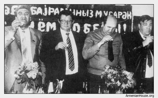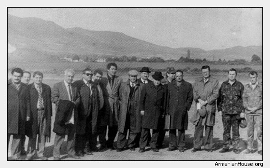 Слева направо: первый секретарь Шушинского райкома компартии Азербайджана В. Джафаров, заместитель председателя Совета министров Азербайджанской ССР В. Радуев, комендант НКАО генерал-майор внутренних войск В. Сафронов, второй секретарь ЦК компартии Азербайджана и Председатель Республиканского Оргкомитета по НКАО В. Поляничко г. Шуши, 1990 г.